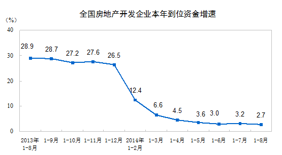 1-8月份,房地產開發企業到位資金79062億元,同比增長2.7%,增速比1-7月份回落0.5個百分點。其中,國內貸款14664億元,增長13.8%;利用外資341億元,下降0.9%;自籌資金32618億元,增長11.6%;其他資金31440億元,下降8.9%。在其他資金中,定金及預收款18905億元,下降10.7%;個人按揭貸款8697億元,下降4.5%。