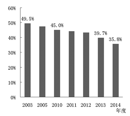 同“十五”相比,水泥制造業固定資產投資用于購置工器具設備的比例出現下降(圖7),“十五”末期,用于購置工器具設備的投資占行業投資的47.5%;2013年末這一比例下降到39.7%,建筑安裝工程投資占到投資總額的53.7%,水泥行業投資目前仍然以規模擴展為主,而技術性投資不足(圖8),拖緩了水泥轉型升級步伐。