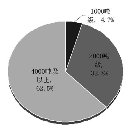 圖3 2003~2013年年末實際運營新型干法生產線日產規模構成情況