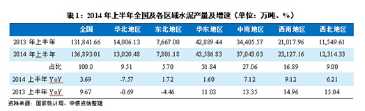 (1)需求:受基建、房地產等固定資產投資增速下滑影響,2014年上半年水泥行業下游需求疲軟,全國水泥產量同比增長3.69%,各區域表現繼續分化:中南、西南及西北地區需求表現尚可,東北地區和華東地區基本維持上年同期水平,華北地區需求下滑較為明顯