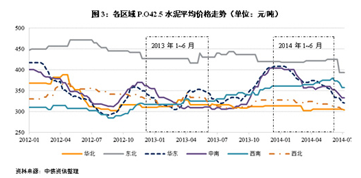 2014年以來受房地產開發投資增速及基建投資增速下滑影響,2季度末全國水泥均價較年初下降約36元/噸,截至6月末全國P.O42.5水泥均價為337元/噸,但仍高于去年同期的330元/噸。分區域表現來看,受區域內需求較好影響西南地區水泥價格自年初以來走出一波上漲行情,至6月末區域內水泥均價已達369元/噸,高于去年同期約44元/噸;東北地區水泥價格維持年初水平,中南、華東地區價格較年初出現較大幅度下滑,但價格仍高于去年同期水平;華北地區受需求疲軟影響,價格出現下滑且均價位于全國較低水平;西北地區盡管需求表現略好,但受區域產能過剩及新增產能繼續釋放影響,價格呈下跌走勢。
