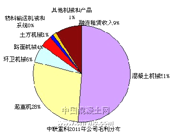 2012年一季度,中聯重科實現總營業收入116.09億元,同比增長8.14%,實現歸屬于母公司股東的凈利潤20.89億元,同比增長3.22%,利潤總額為24.92億元,同比增長5.01%。2011年公司混凝土機械收入占比為47%,毛利占比為51%。今年一季度公司綜合毛利率為32.09%,同比增長0.57個百分;同時在商混率提升和需求下沉的帶動下,毛利率較高的混凝土機械將仍然保持較快的增長,混凝土機械同比增長超過40%,市場占有率提升較大。同時,受益于鐵路、保障房建設與商品混凝土普及率上升等因素,混凝土機械的市場份額將得到進一步的提升。