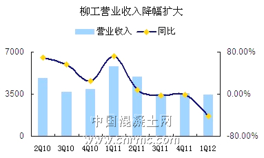 柳工2012年第一季度實現營業收入34.3億元,同比下降42.3%,歸屬母公司凈利潤1.48億元,同比下降75.8%。其業績下降的主要原因還是由于基建工程的停工、房地產調控等因素導致行業步入下滑道,使得公司一季度銷售狀況處于低迷狀態。從2010年第二季度開始至今,柳工集團的營業收入下降幅度逐步擴大,同時毛利率也在逐年下降,兩者均處于低位水平。混凝土機械在公司產品所占份額比重較小,無法扭轉其他工程機械利潤下降給企業所帶來的沖擊。
