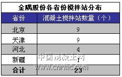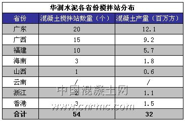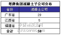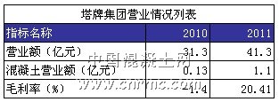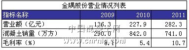 2011年全年實現(xiàn)混凝土產銷41.69萬方、營業(yè)收入11418.03萬元;集團混凝土子公司已達到38個,同時公司參股的合營攪拌站也已達28個,主要分布在廣東、江西、福建等地,其中以廣東為主要發(fā)展地區(qū)?;炷翑嚢枵驹陟柟坦舅噤N售和穩(wěn)定水泥價格方面的協(xié)同作用初見成效。