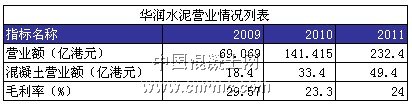 2011年華潤集團擁有拌站數(shù)量54個,主要集中分布在廣東、廣西、福建等地;總產能達3200萬方,銷量1.38萬方,毛利率為24%,同比增長0.7%;公司近年來著力發(fā)展混凝土事業(yè),預計2012年全年混凝土產能將達3920萬方。由于2012年第一季度水泥的毛利潤持續(xù)下跌,華潤集團未來將通過并購擴大產能。根據(jù)公司目標,2014 年底水泥及熟料的產能將分別增加至890萬噸及660萬噸,混凝土產量將升至5630萬立方米。