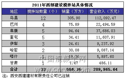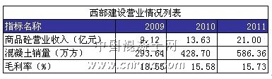 2011年,西部建設集團共計33個攪拌站,集中分布在新疆烏昌及巴州等地。公司共生產銷售商品混凝土586.36萬立方米,比2010年增長36.78%;營業(yè)收入209965.64萬元,比2010年增長54.08%;商品混凝土毛利率15.73%,同比增長0.15個%?!笆濉逼陂g,公司規(guī)劃繼續(xù)以混凝土業(yè)務為核心,合理延伸產業(yè)鏈,提升產業(yè)整合能力,推進全產業(yè)鏈運營。同時,擇機進入西北市場和內地市場,成為混凝土行業(yè)的領軍企業(yè)。2012年該公司計劃完成660萬立方商品混凝土,全年實現(xiàn)利潤總額16790.75萬元,較上年實際數(shù)16167.07萬元,增加623.68萬元。