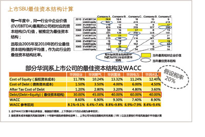 資本結構真正關注的是WACC(加權平均資本成本)。我們首先研究最佳資本結構,然后研究股東要求的回報。我們現在要定期公布華潤集團主要行業的加權平均資本成本,這樣,在經理人進行相關決策判斷的時候,可以用WACC作為貼現率的底線。