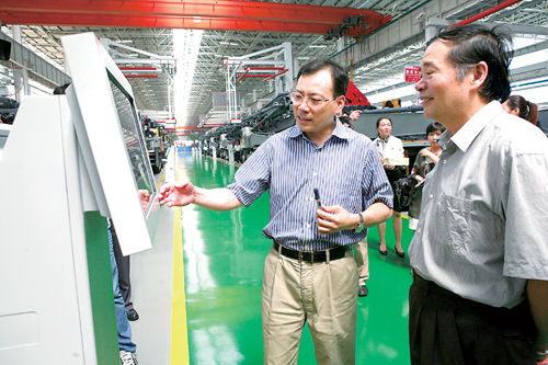圖為三一集團總裁唐修國(左一)向客人介紹三一的制造執行系統(MES)。