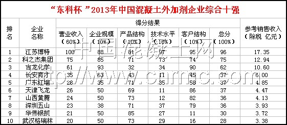 混凝土外加劑企業(yè)綜合十強(qiáng)評(píng)選是以2013年各企業(yè)實(shí)際銷售額為依據(jù),數(shù)據(jù)主要來自各外加劑企業(yè)上報(bào)、企業(yè)年報(bào)以及政府審計(jì)報(bào)告。部分企業(yè)因數(shù)據(jù)提 供不完整、不及時(shí),暫未被列入其中,望相關(guān)企業(yè)在下次評(píng)選中積極踴躍參與,共同推動(dòng)外加劑行業(yè)的繁榮與發(fā)展。由于時(shí)間有限,本次評(píng)選難免有所疏忽,若其中 數(shù)據(jù)有所偏差,請聯(lián)系我們!